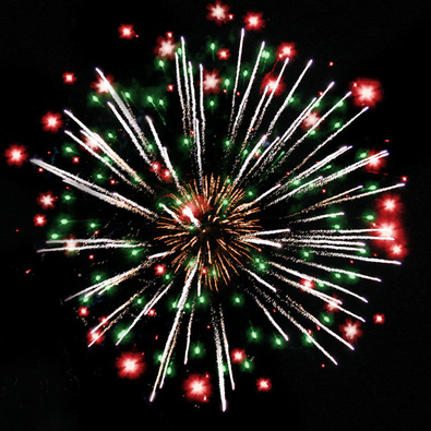 Разноцветные кометы разрываются сферами из серебряных форсов, крупных цветных мерцающих огней с серебряными трещащими искрами.