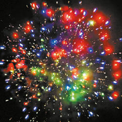 Сфера серебряных хвостов с переходом в цветные звезды и мерцание .Разноцветные ппышные хвосты и облако треска.