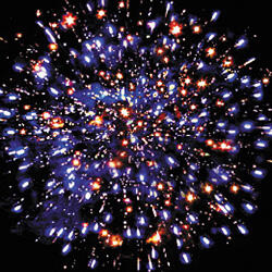 Цветные звезды с пышными хвостами, мерцание и облако треска. Разноцветные мерцающие сферы. Трещащий разрыв. Сфера золотых хвостов.