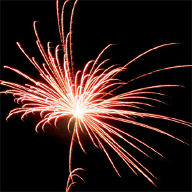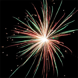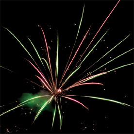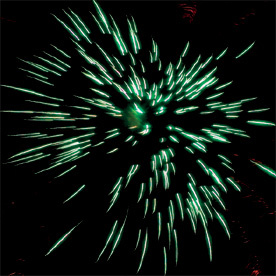 Разноцветные кометы разрываются сферами из: серебряных форсов; зеленых огней; синих огней; красных огней; белых мерцающих огней; зеленых и фиолетовых огней; красных и зеленых огней; синих и белых мерцающих огней.