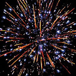 Цветные звезды с пышными хвостами и мерцание. Множество золотых и серебряных ниспадающих нитей и облако треска.
