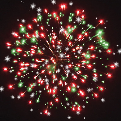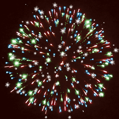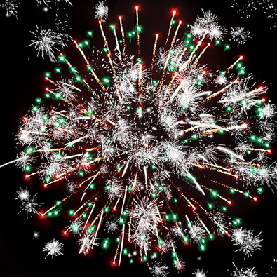 Разноцветные кометы разрываются сферами из цветных мерцающих и трещащих огней.