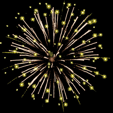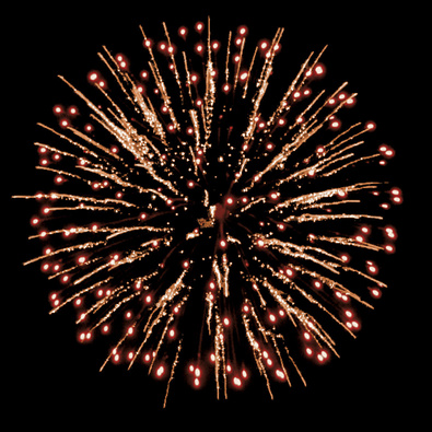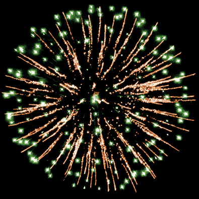 Трещащие с золотыми искрами трассы разрываются сферами из коротких искристых золотых форсов и цветных огней.