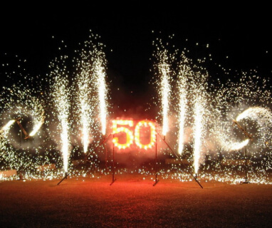 Линии фонтанов начинают шоу. Далее цветными огнями загораются два трилистника. После этого подключается цветная огненная надпись с именем юбиляра. По краям вращаются две серебряные вазы с форсом трещащих искр до трех метров. Два горящих золотых пятилистника с цветными звездами завершают программу.
